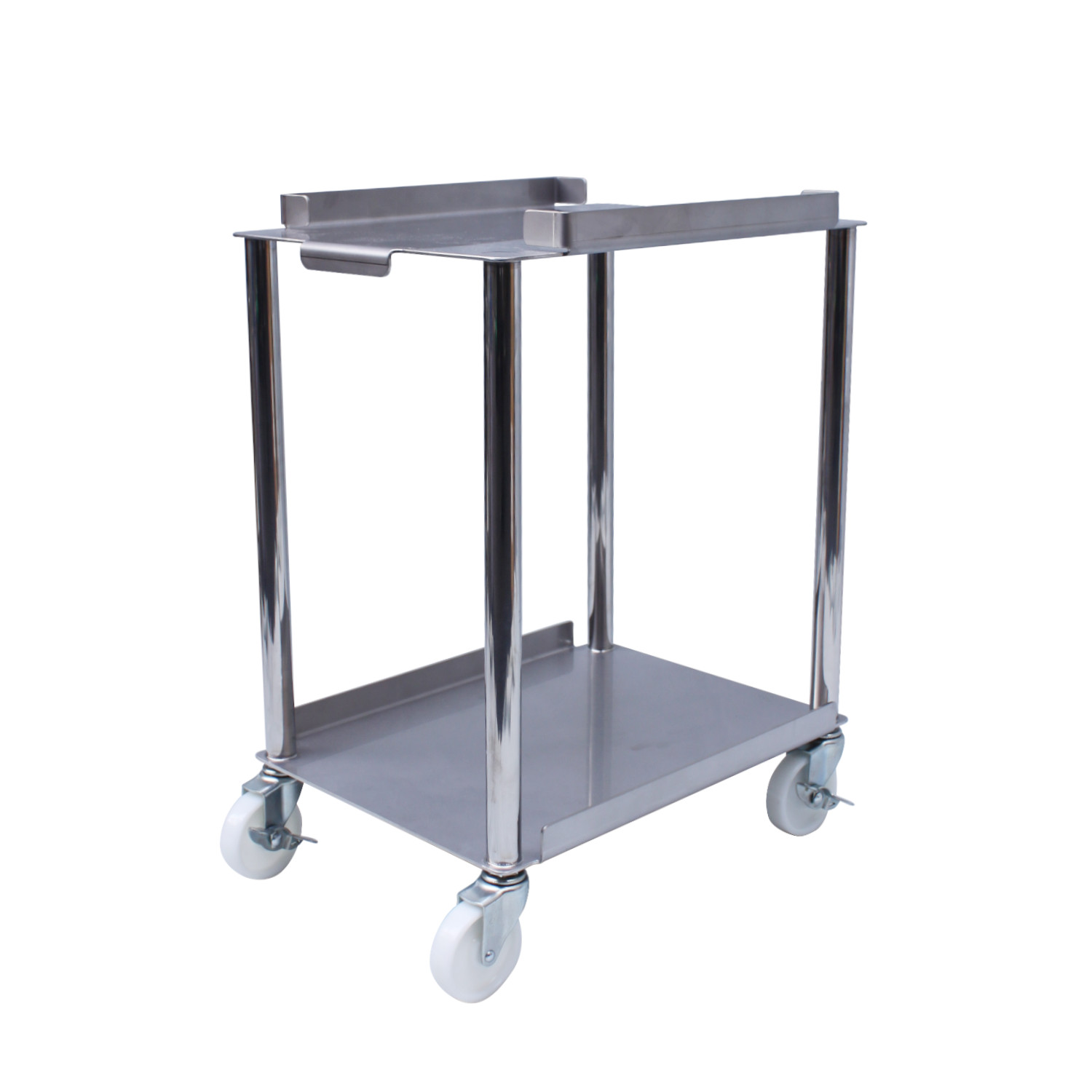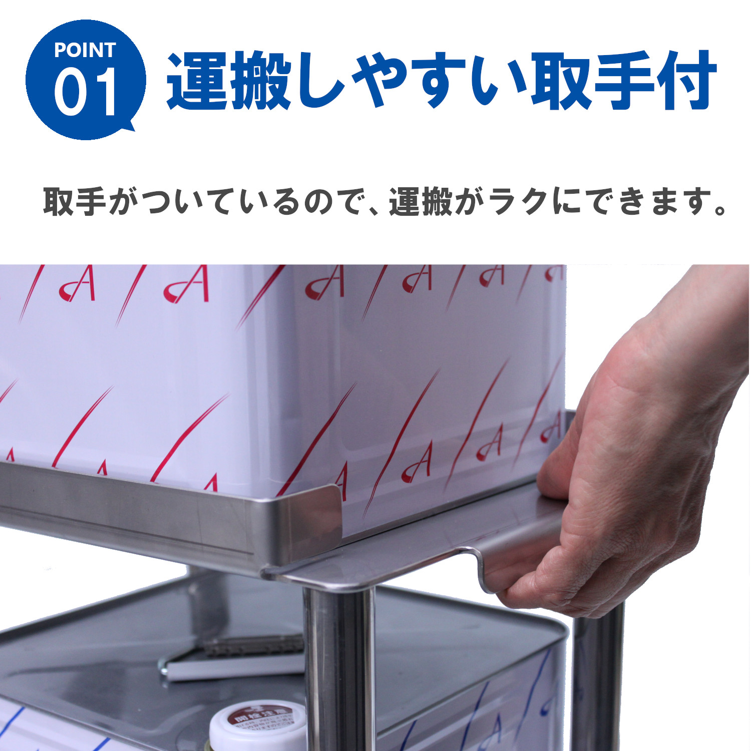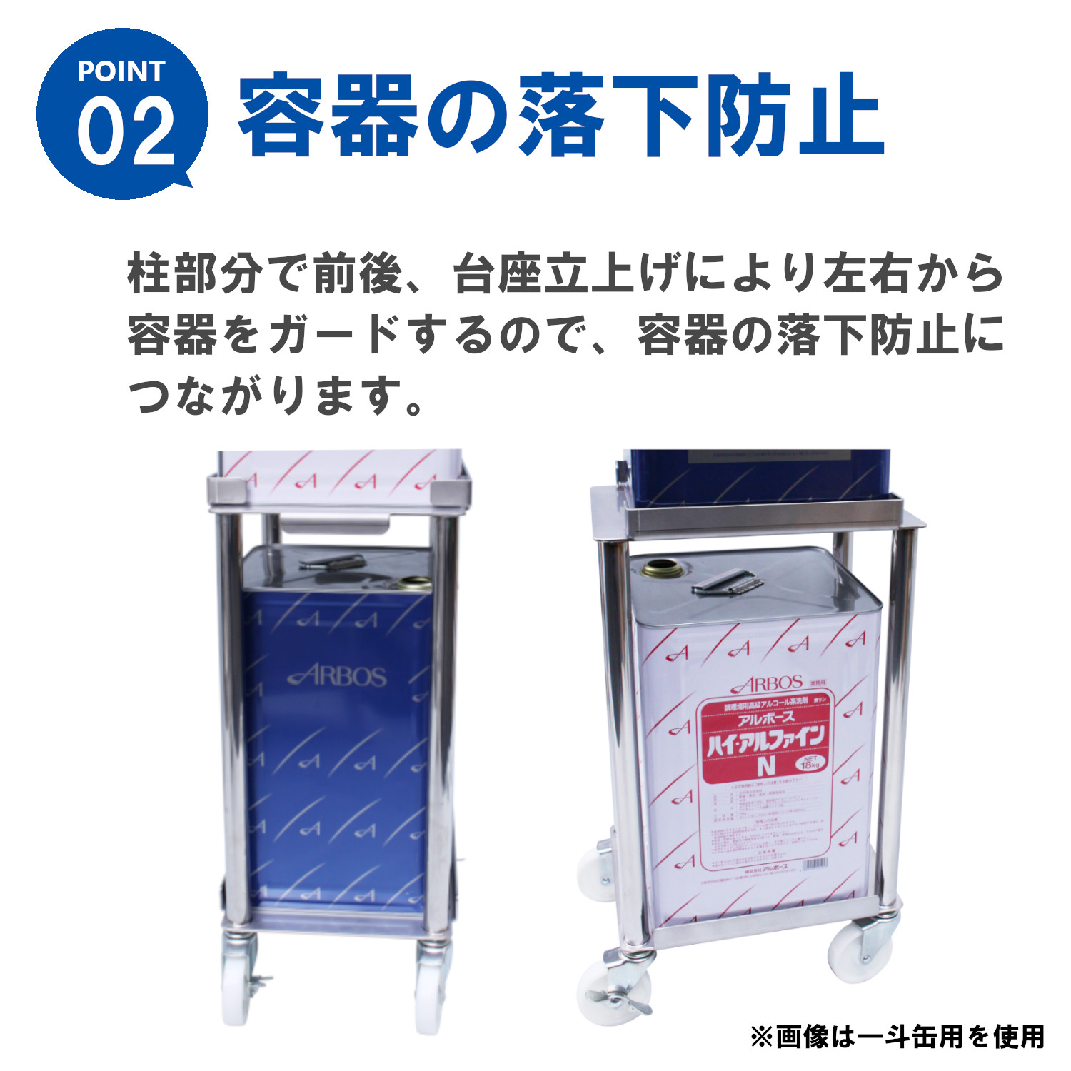 HACCP基準である床面から30cm以上をクリアしたW型2缶用台車です。一台の台車で2缶保管出来、重たい容器の運搬もラクにできます。また、床面に置かないため、床を汚すことなく衛生的です。