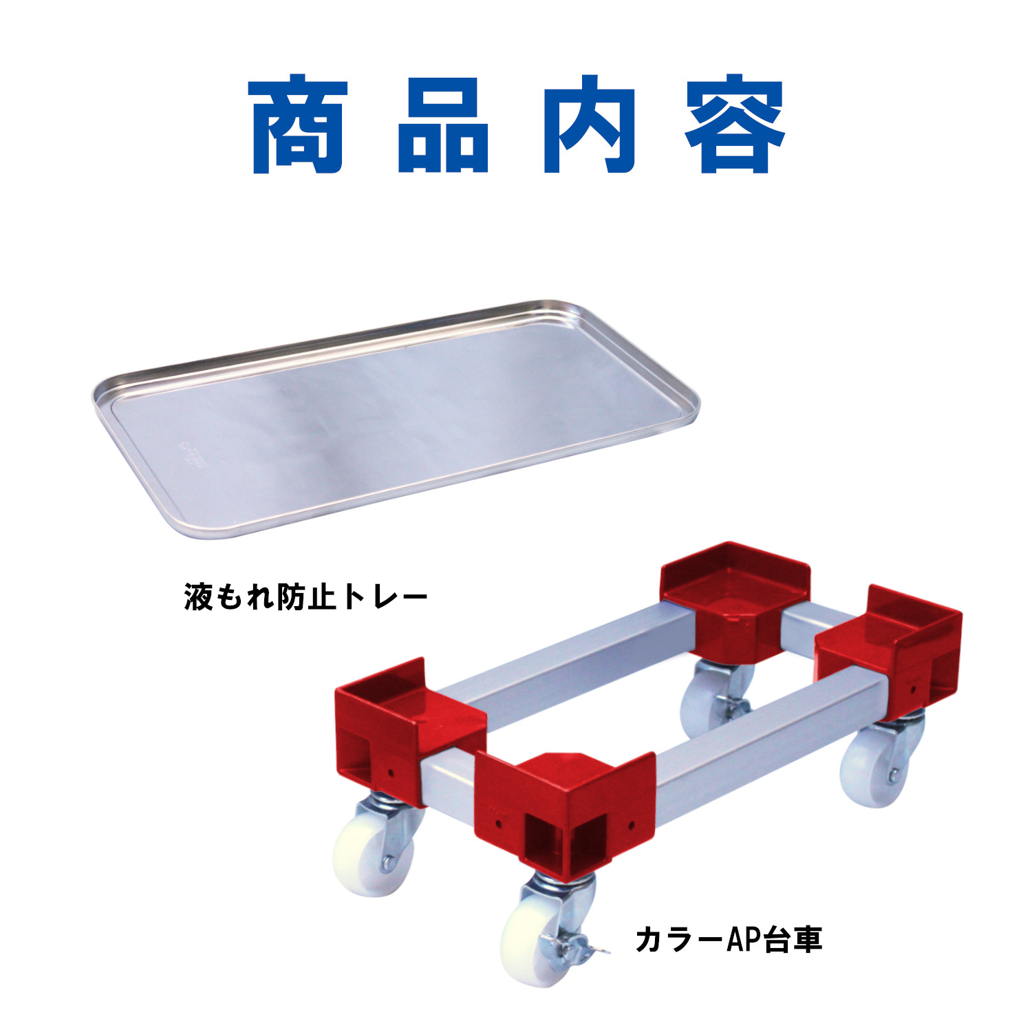 ポリカジョイントとアルミ(アルマイト加工済)を組み合わせた「カラーAP台車」に液もれによる床面汚れ防止につながる「液もれ防止トレー」がセットになった台車です。容器の運搬・保管がラクにできます。
