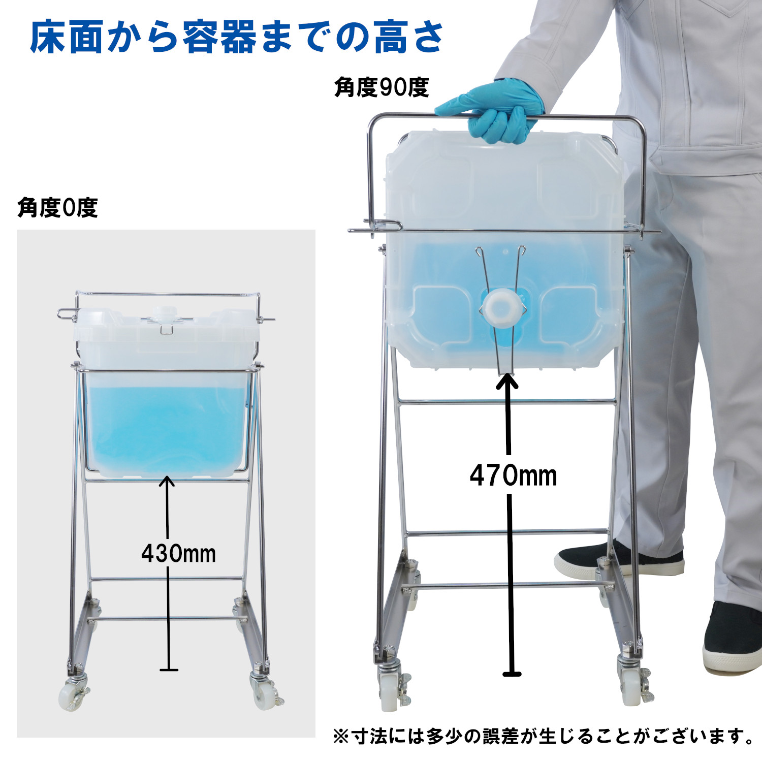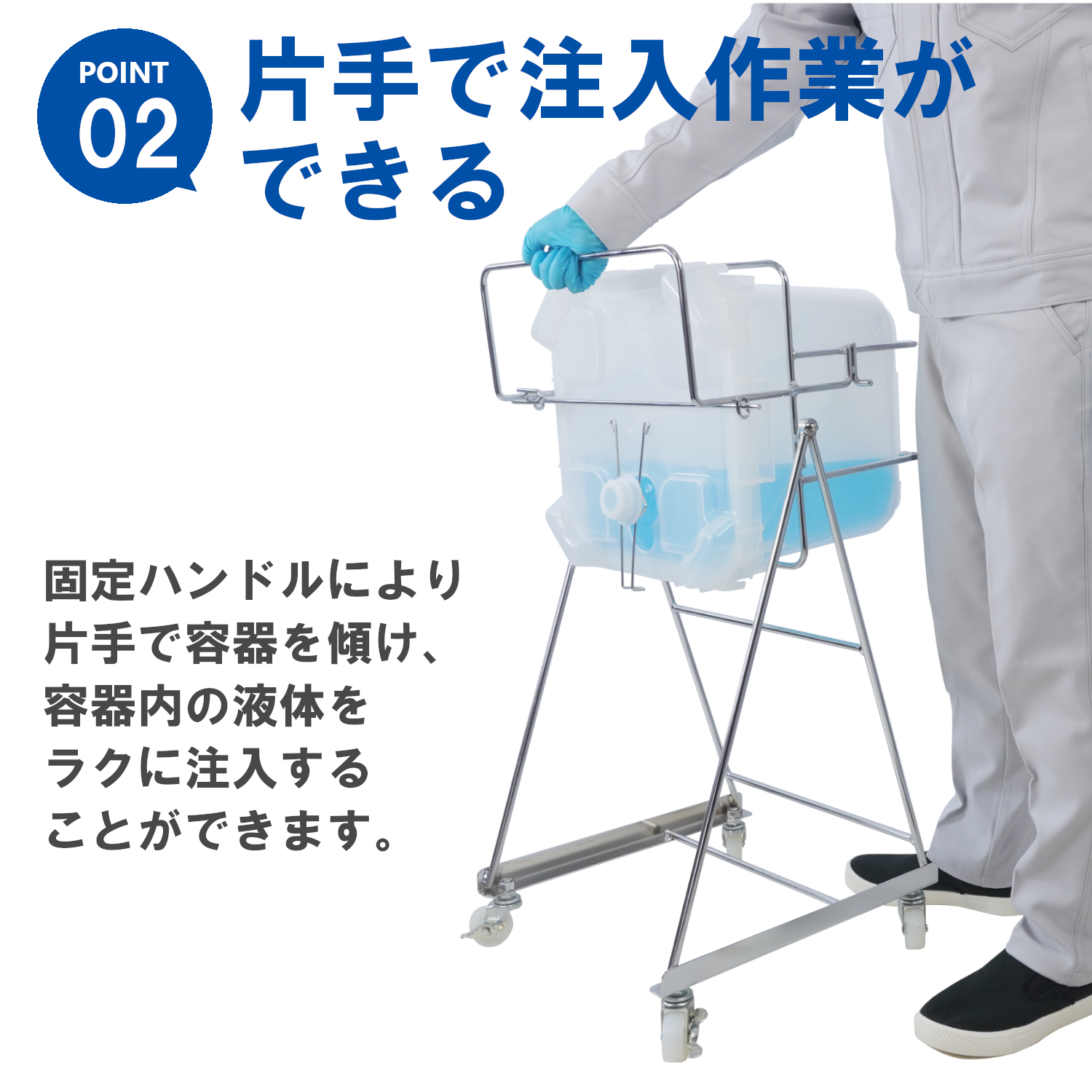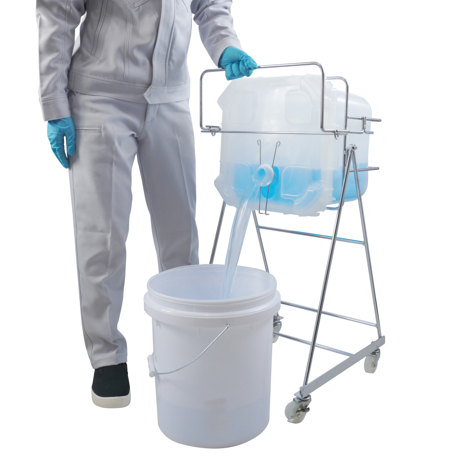 バックインコンテナーを固定してハンドルで内容物をラクに移す、内容物を少しづつ分けて注ぐことができます。床面も汚さず、保管にも大変衛生的です。キャスターがあるので移動がラクにできます。