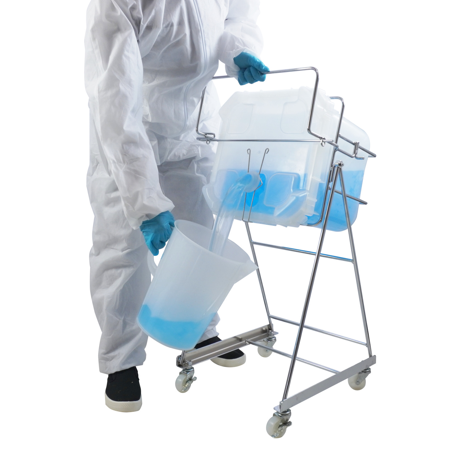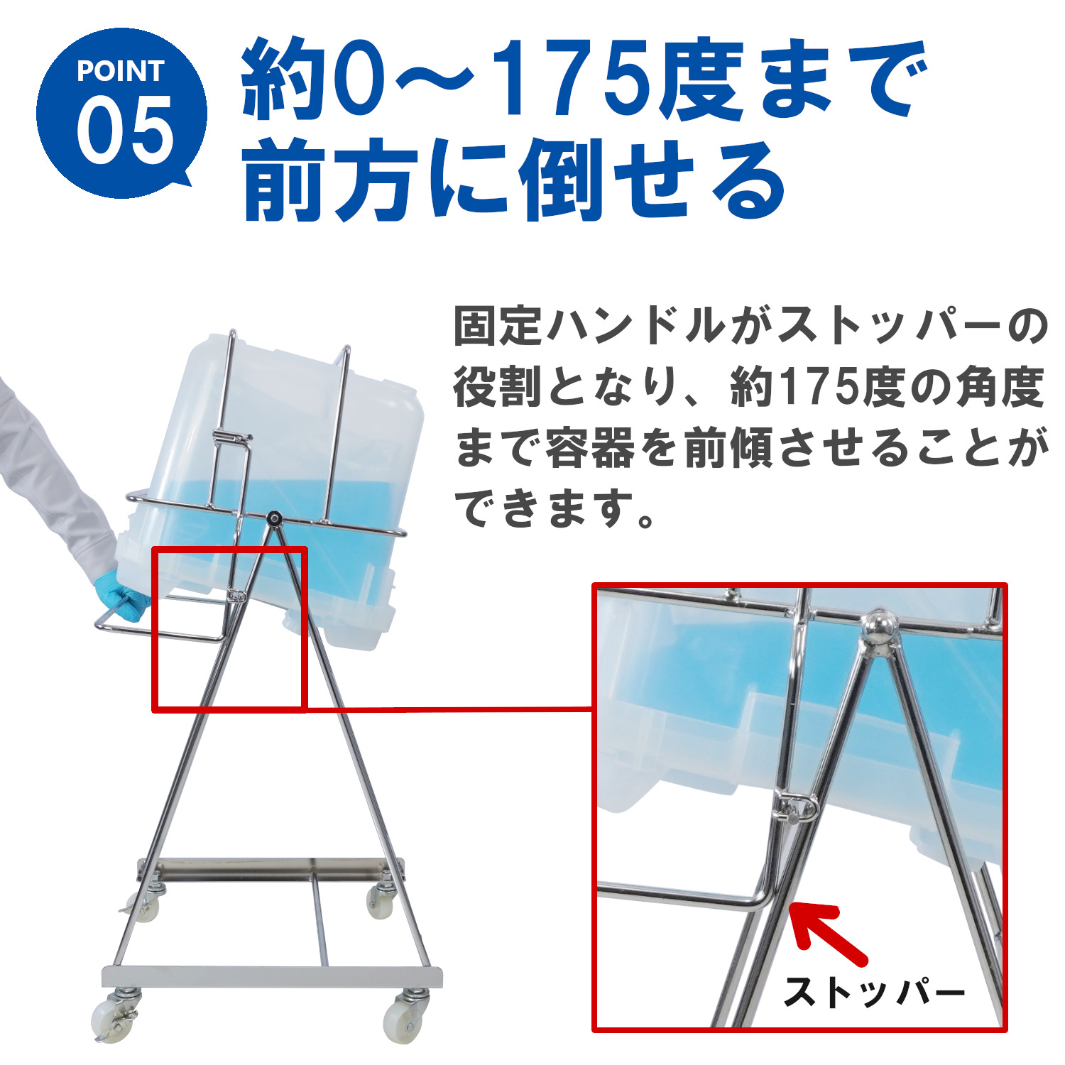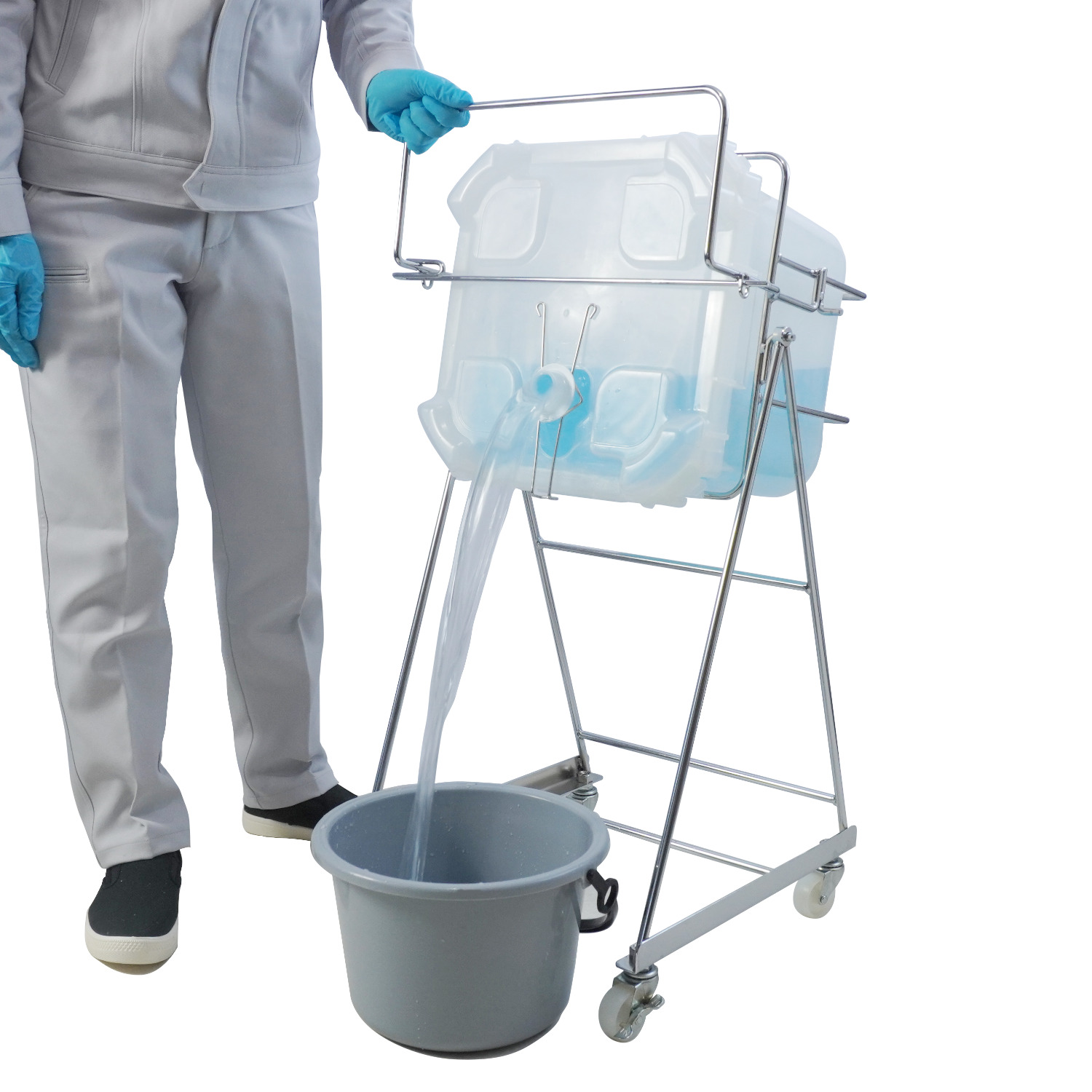 バックインコンテナーを固定してハンドルで内容物をラクに移す、内容物を少しづつ分けて注ぐことができます。床面も汚さず、保管にも大変衛生的です。キャスターがあるので移動がラクにできます。