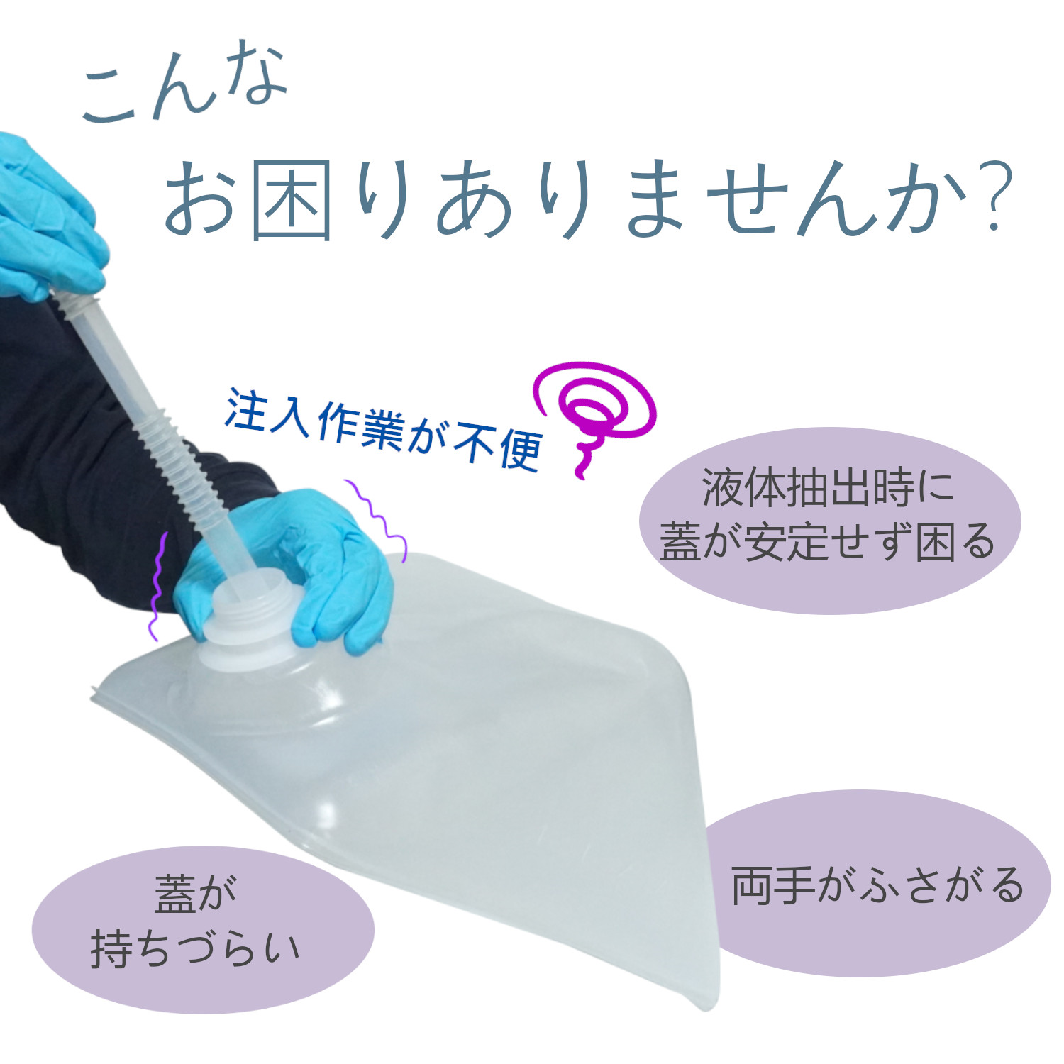 スタンドのU字部分に容器の蓋口部分をはめ込むことで固定され、液体注入作業をラクに行うことができます。