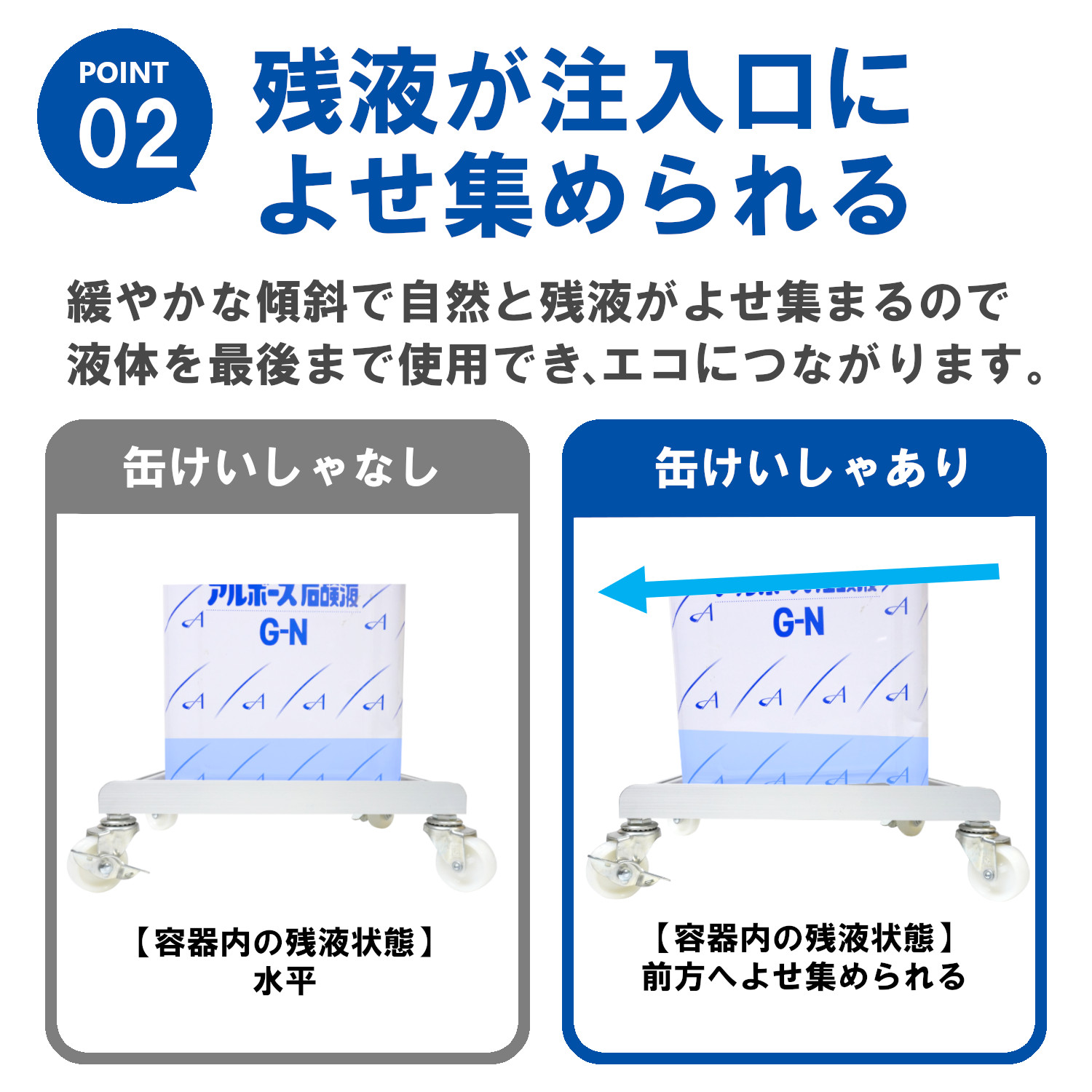 超軽量の台車「ごくかるキャリー」に「液もれ防止トレー」と「缶けいしゃ」をのせることで、残液を緩やかなけいしゃで寄せあつめ、容器からの液もれによる床面汚れを防止でき、重たい容器の運搬・保管がラクにできます。