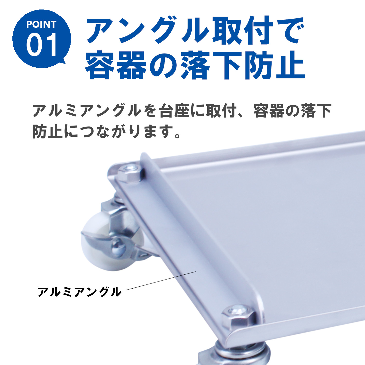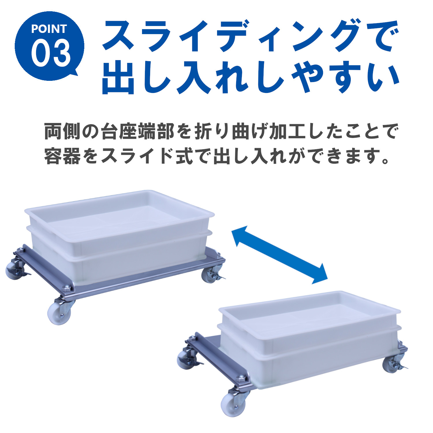 大変シンプルな構造、ステンレス304のアングルとステンレス304製部品、キャスターで構成しています。コンテナーをスライディングして出し入れすることができます。