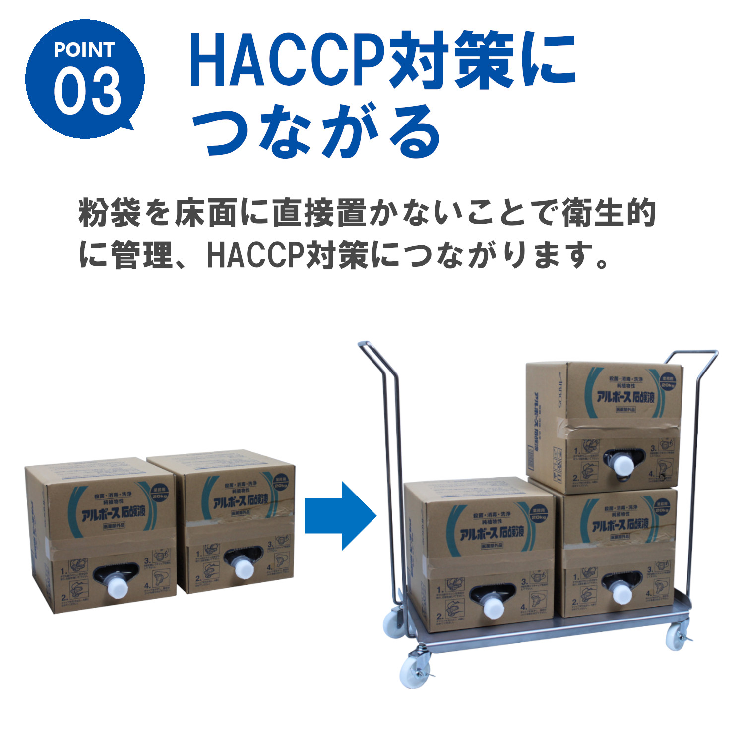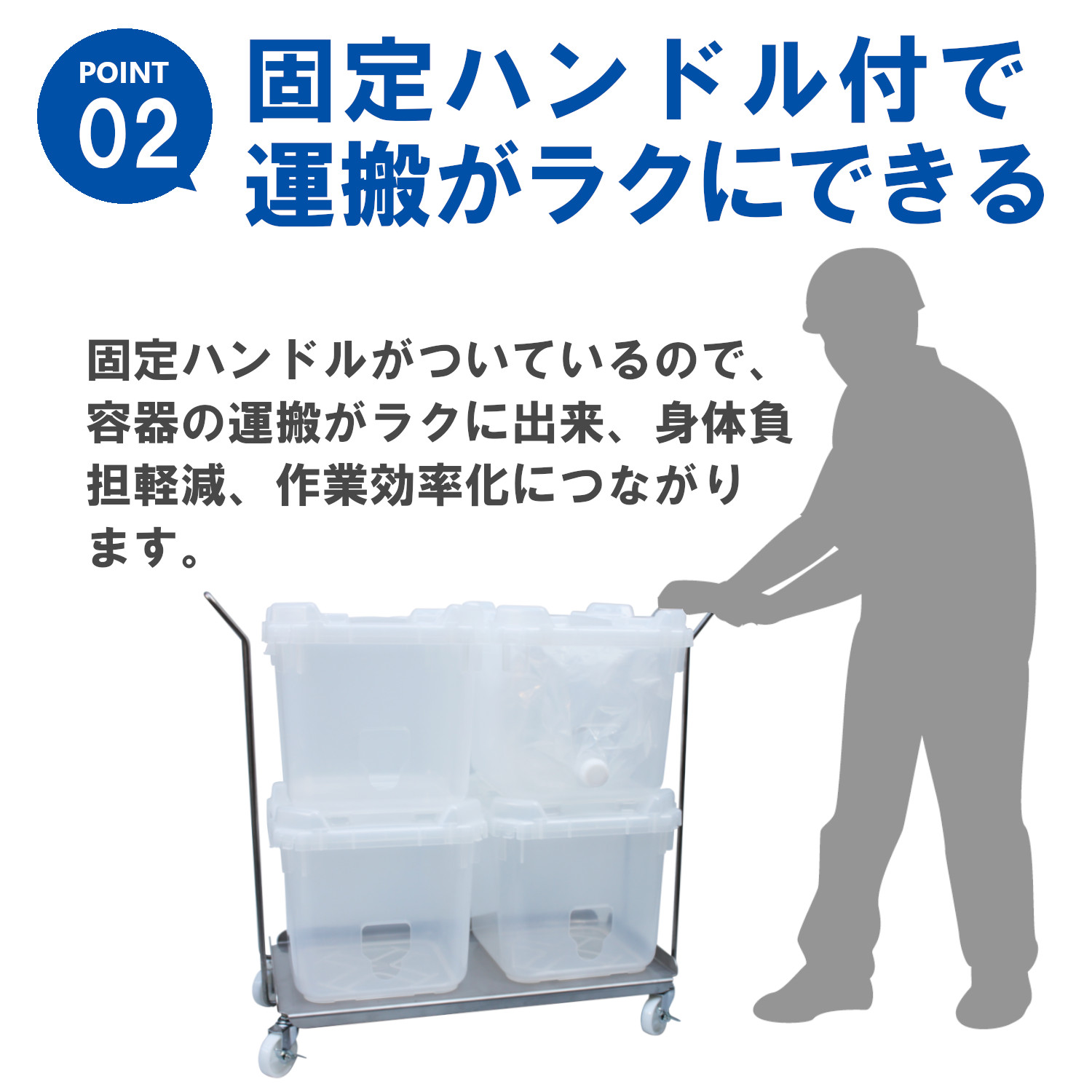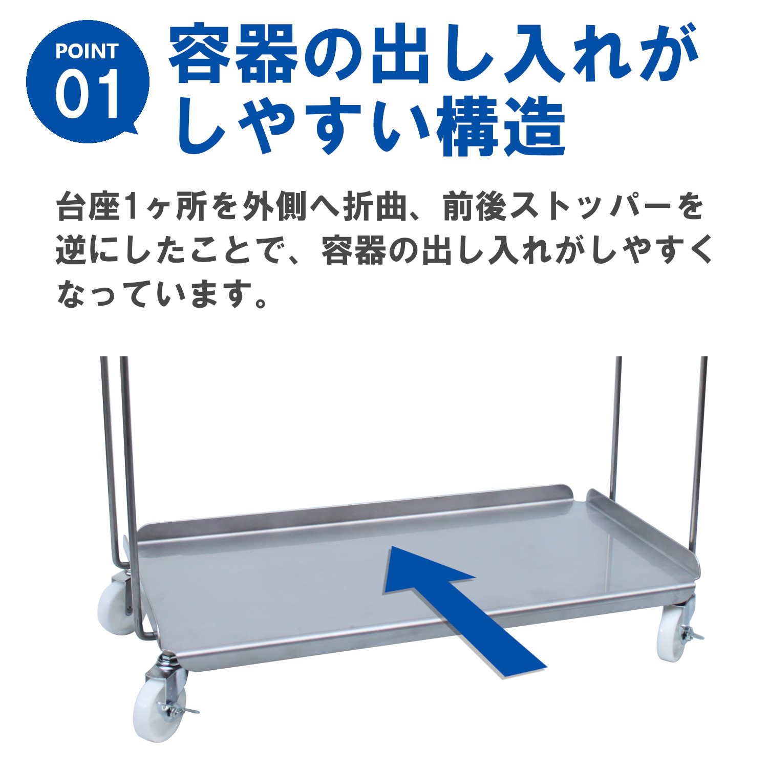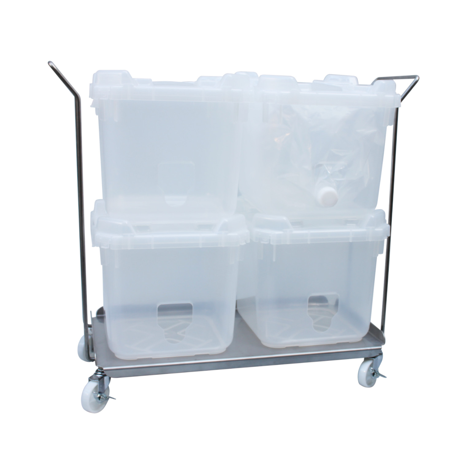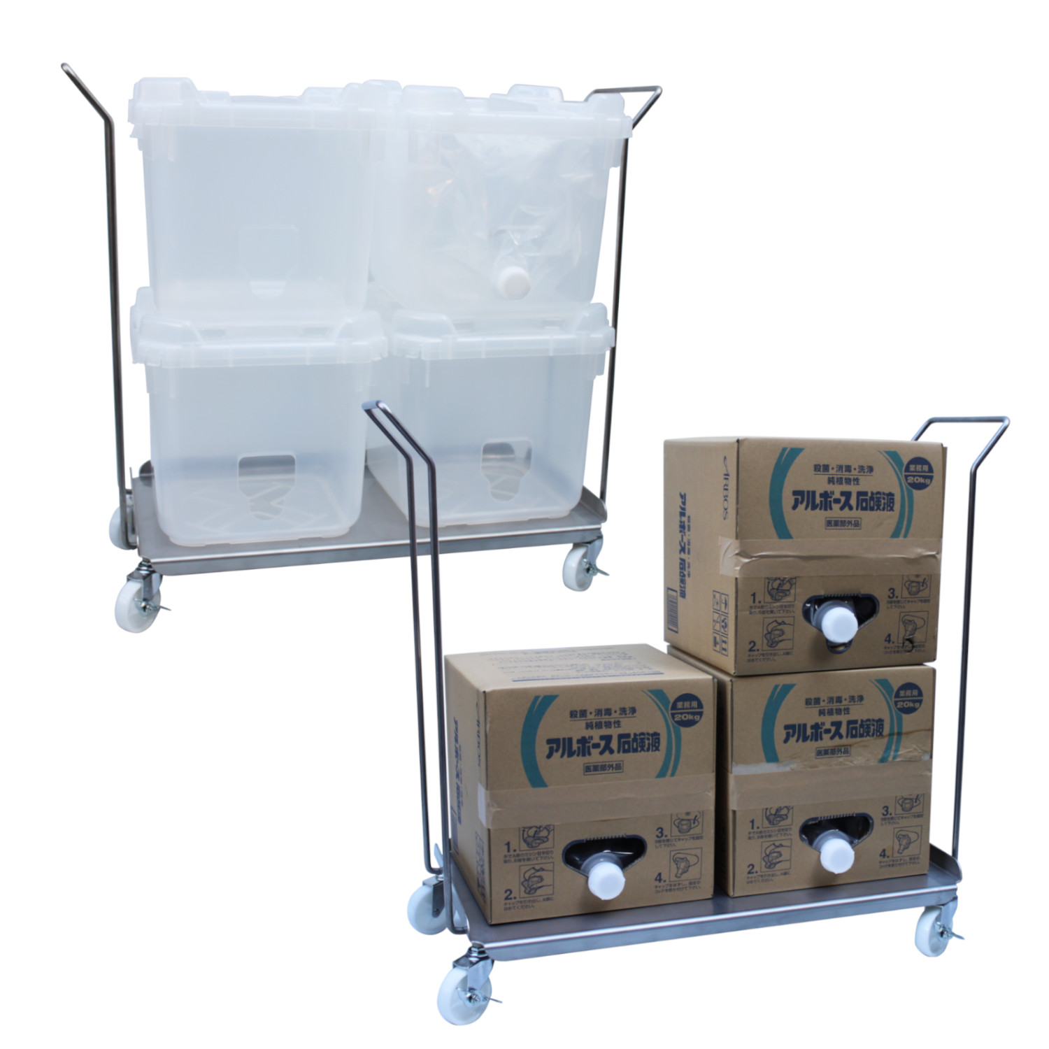 バックインボックスやバッグインコンテナーを積み上げて収納することが出来るキャリーです。ステンレス304製なので水洗いで管理することが出来、両サイドにハンドルが付いているので移動もラクに出来ます。